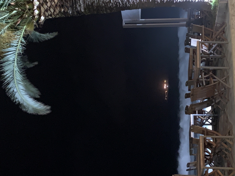 A night scene features tables and chairs lined up along a boardwalk or patio, partially obscured by a palm tree branch in the top left corner