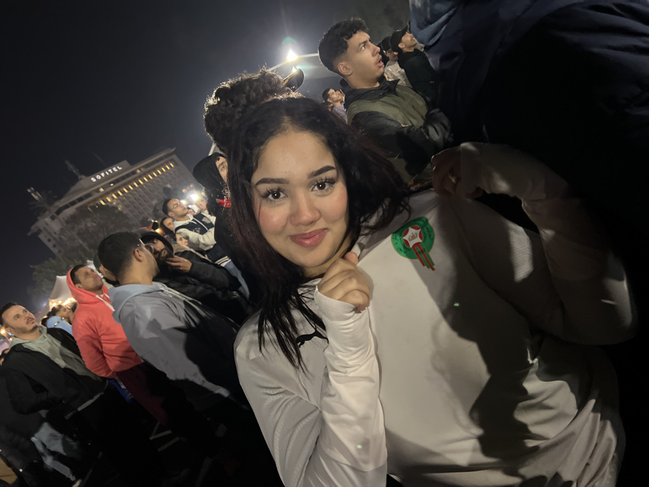 A young woman smiles at the camera, wearing a white long-sleeved shirt with a Moroccan flag emblem. She stands in a crowded outdoor setting at night. Behind her, several people look up at something out of frame. The Sofitel building is visible in the background, lit up. Streetlights and other buildings contribute to the bright, nighttime atmosphere. The image suggests a celebratory gathering or event.
