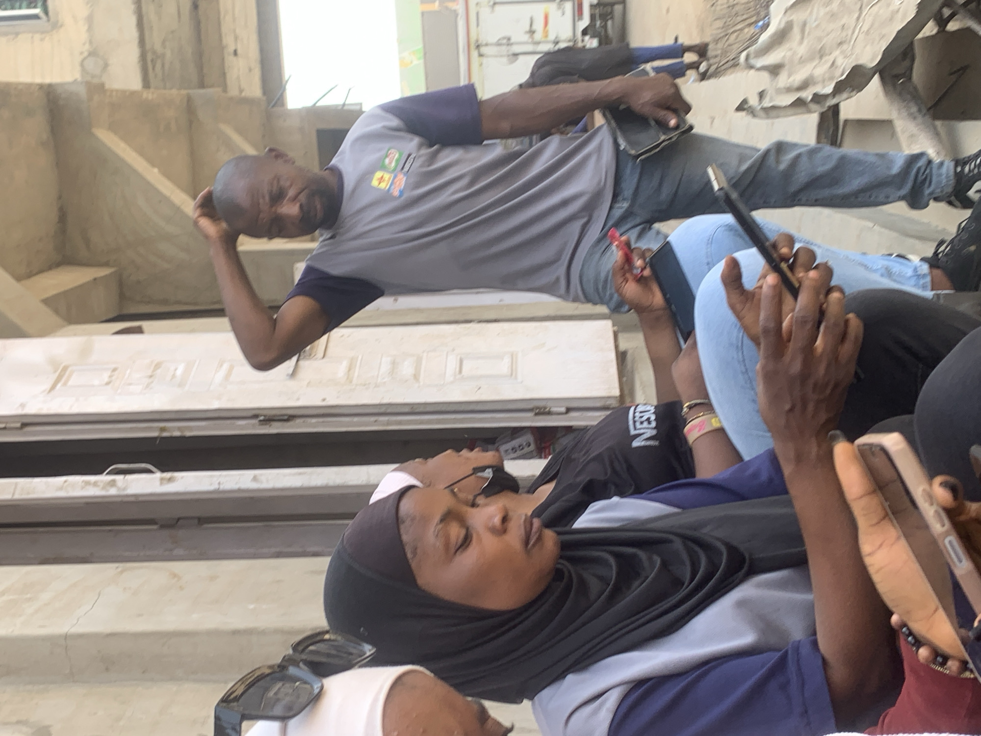 This image depicts an outdoor urban scene in Fagge C, Nigeria, during daylight. In the foreground, three individuals are present. On the far left, a partially visible person wears a white head covering and dark sunglasses atop their head. Adjacent to this, an adult female with a light complexion is seated, wearing a black hijab, a blue and light grey long-sleeved shirt, and light blue jeans. She is actively viewing a light-colored smartphone held in her hands, which display dark nail polish. To her right and slightly behind, a second adult female is partially visible, wearing a black t-shirt with "NESCA" branding, a pink head covering, and a black face mask. She holds a red object, possibly a smartphone, in her left hand and wears a yellow-pink bracelet on her right wrist. In the mid-ground, a standing adult male of dark complexion, with a bald head and short beard, wears a grey short-sleeved t-shirt with multiple colored logos on the chest, dark blue sleeves, light blue jeans, and black athletic shoes. His right hand is raised, with fingers touching his scalp, while his left hand holds a black wallet or small book. His gaze is directed downwards. The background features a light-colored building with a visible wooden doorframe directly behind the subjects. Beyond this, an unfinished concrete structure with exposed beams and rebar is visible. In the distant background, a white box truck and other indistinct figures suggest a street or open public area. On the ground to the right of the standing man, a grey, irregular-shaped object, possibly debris, is present. The scene conveys a casual gathering or waiting in a public space.