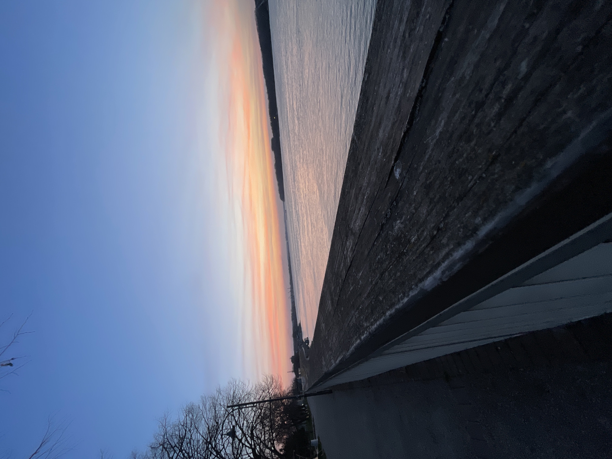 The image presents a panoramic view of the Danube River embankment in Silistra, Bulgaria, captured during twilight conditions. The sky transitions from a deep blue overhead to a gradient of orange, pink, and light red hues at the horizon. The river's surface, calm and reflective, mirrors these sky colors, appearing silvery with subtle pink and blue tones. In the foreground, a dark, weathered wooden railing or capstone extends diagonally from the lower right towards the center, separating an asphalt pathway on the left from the water. Beneath the railing, a lighter-colored vertical wall structure is visible. Along the pathway on the far left, a row of bare deciduous trees stands, their dark silhouettes contrasting against the illuminated sky. Multiple streetlights are discernible along the path but appear unlit or dimly lit. Across the expanse of the river, a dark, low-lying landmass or opposing riverbank is visible, consistent with tree cover. Faint outlines of industrial structures, potentially cranes, are present along this distant bank. No individuals or active subjects are observed within the scene.