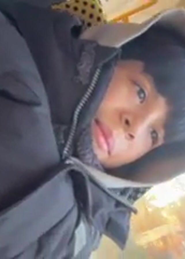 A young boy with dark hair and brown eyes is seen in a close-up video. He is wearing a black puffy jacket with the hood up and the zipper pulled up to his neck. The hood has a light-colored lining. He is sitting on a bus, leaning against a seat. The background includes a window with bright sunlight and buildings visible outside. The boy looks directly at the camera and speaks, and his expression is somewhat tired or subdued.