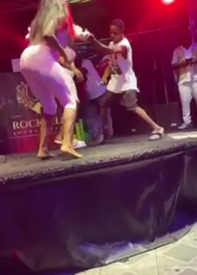 A stage with multiple people, mostly women, dancing to music. The woman in the foreground is wearing a pink, form-fitting off-the-shoulder outfit and is barefoot. There's a man in a white tank top and shorts dancing nearby. The stage is carpeted and has a graphic design on the backdrop. A speaker is also visible. The lighting is dark with red and purple accents. A crumpled aluminum can sits on the ground in front of the stage.