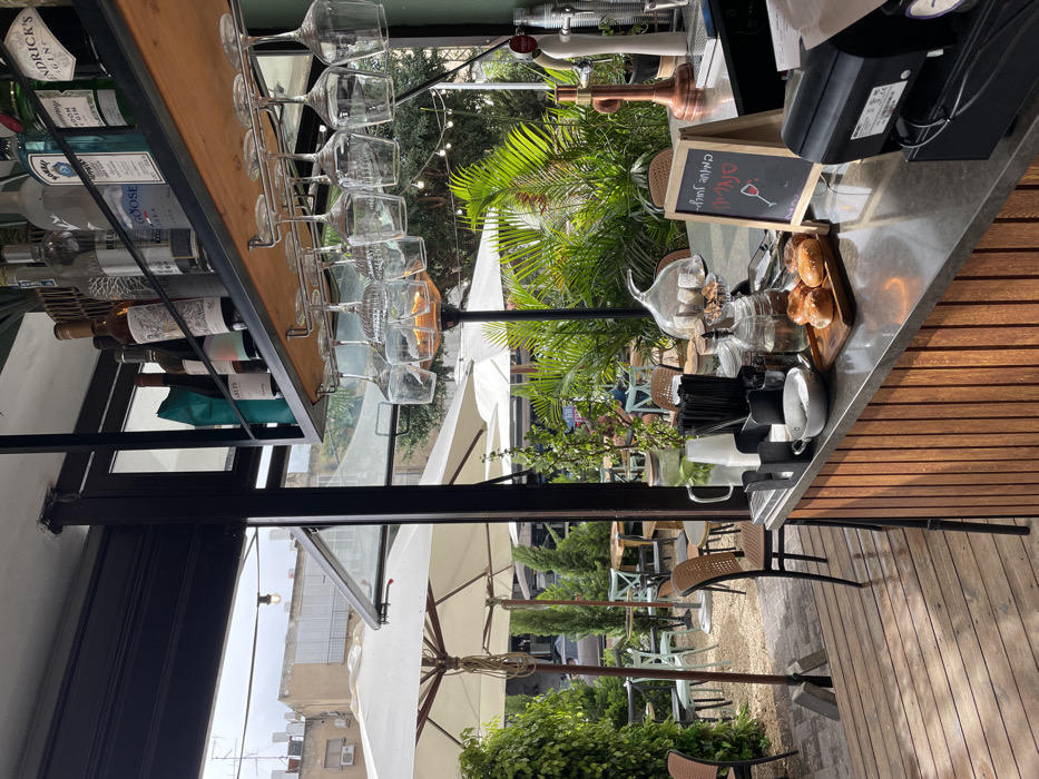 The image depicts the interior bar area of a cafe looking out into an outdoor garden seating space in Herzliya, Israel