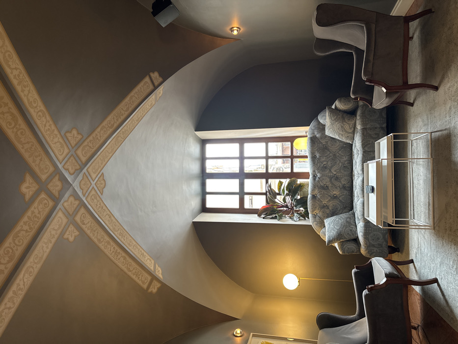 The image displays an interior lounge area located within a building in Lviv, Ukraine. The space features a vaulted ceiling painted a dark gray, adorned with ornate cream and light brown decorative bands that form an 'X' pattern across its apex. The walls are a solid dark gray. A prominent arched window with multiple rectangular panes, framed in dark wood, is centrally positioned at the far wall, admitting natural light and partially revealing an exterior street view. Furnishings include a light gray-blue patterned, tufted sofa situated centrally, flanked by two dark gray upholstered wingback armchairs with visible dark wood frames. In front of the sofa, two rectangular white metal coffee tables are nested, with a small dark blue cylindrical glass object placed on the upper table. A light-colored, subtly patterned area rug covers the floor. Lighting is provided by natural light from the window, two circular wall-mounted sconces with exposed bulbs (one on each side wall), and a brass-finished floor lamp with a spherical white glass shade positioned to the left of the sofa. A potted plant displaying green and reddish leaves is placed on the window sill next to a small yellow decorative item. A partially visible framed artwork with a yellow circular motif hangs on the left wall. A black speaker is mounted high on the right wall. No individuals are present.