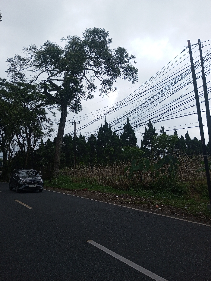 A black car travels on an asphalt road with white lines under a cloudy sky. Tall trees with dense foliage frame the left side of the image, while utility poles and a thicket of wires clutter the right. Behind the roadside vegetation, a line of tall evergreen trees provides a backdrop, suggesting a forest or park setting. The scene has a somewhat gloomy and overcast atmosphere.