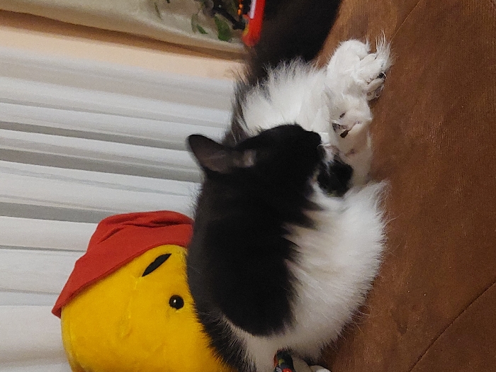 An indoor scene in Plovdiv, Bulgaria, depicts a black and white long-haired cat lying on a brown upholstered surface, possibly a sofa or chair. The cat's head is turned downwards, appearing to groom its front right paw or lower leg. The fur on its back and head is black, transitioning to white on its chest, belly, and paws. Behind the cat, to the left, a large yellow plush toy with a single visible black eye and a red fabric covering its top is partially in view. Further back, a set of white vertical window blinds or curtains are visible. To the far right, a dimly lit object with hints of green and orange coloration is present.