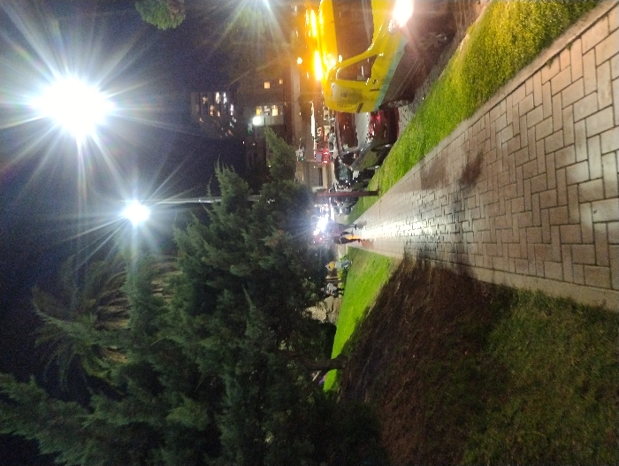 The image presents a nighttime urban scene along a wide paved sidewalk, likely located in the vicinity of Plaza República Oriental del Uruguay or Plaza Mitre in the Recoleta neighborhood of Buenos Aires, Argentina. In the foreground, a textured brick sidewalk, exhibiting areas of moisture and reflective surfaces, extends from the lower center towards the background. To the left of the sidewalk is a sloped grassy embankment, transitioning from dark earth at its base to vibrant green grass higher up. A prominent evergreen tree occupies the left foreground, partially obscuring a palm tree behind it. To the right of the sidewalk, a narrow strip of green grass borders a street. In the midground, a yellow utility van with amber flashing lights on its roof and illuminated headlights is parked curb-side on the right. A row of dark-colored parked vehicles extends behind the van. Multiple human figures are discernible on the sidewalk further along, illuminated by ambient light; one figure appears to be wearing a yellow top on the upper part of the grassy slope to the left. The background features a dark night sky illuminated by several intensely bright streetlights, each displaying a prominent starburst lens flare. Distant high-rise buildings with illuminated windows are visible on the horizon, silhouetted against the night sky.