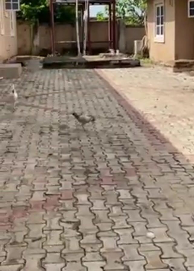three chickens walking around on a paved patio. The patio is made of gray bricks with red accents, and there is a pile of debris on the ground. The chickens are various shades of brown and gray. In the background is a building with a water tower. The building has windows and a door, and the water tower is made of metal.