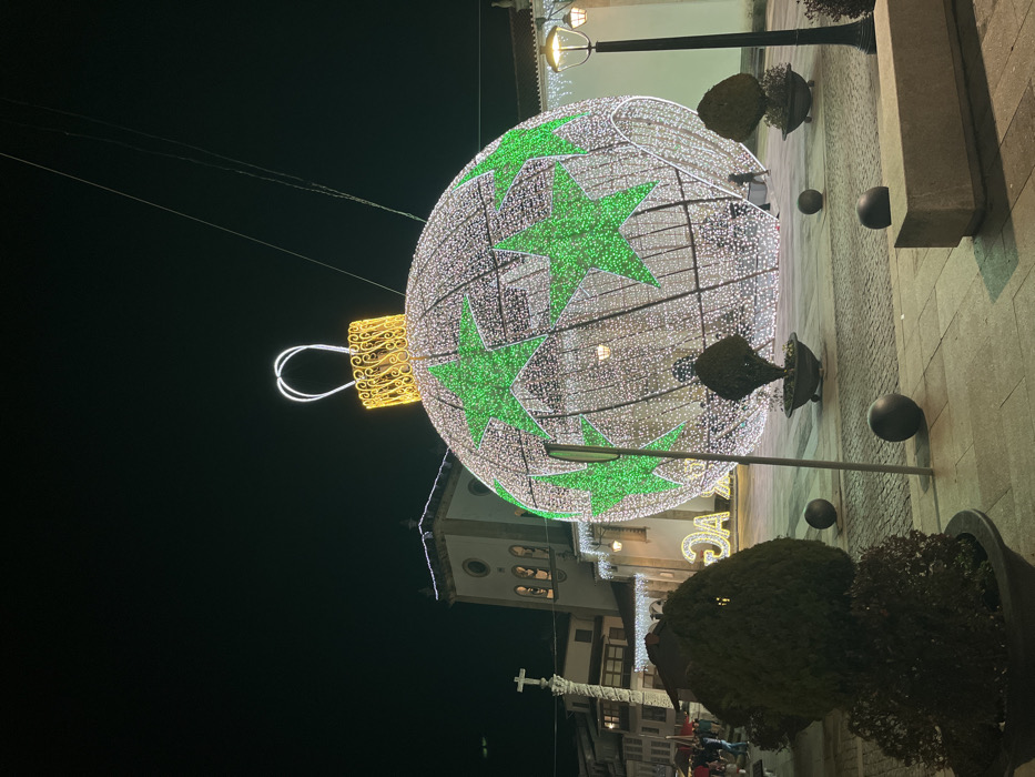 A large, illuminated Christmas ornament dominates the scene, adorned with green stars and set against a dark night sky. The ornament is positioned in a town square, near a church with lighted trim. Street lamps and landscaped planters add to the festive atmosphere. People are visible in the background. The image is rotated counter-clockwise.