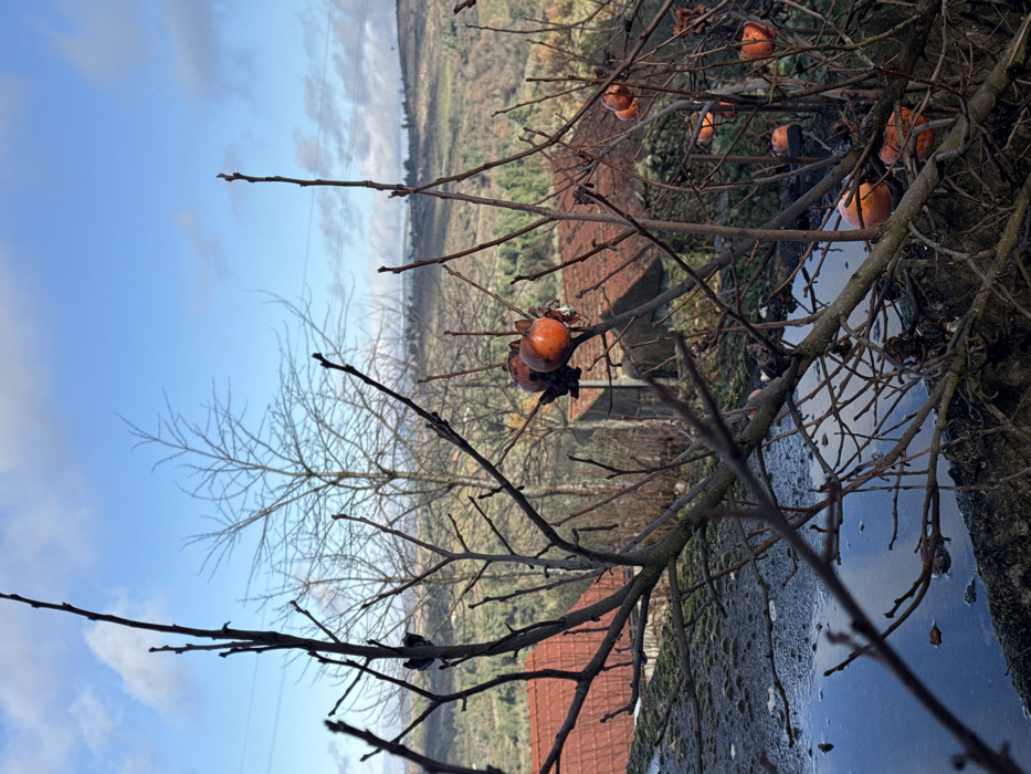 This image depicts a late autumn or winter scene in Freixo de Espada à Cinta, Portugal. The immediate foreground features a dark, textured, moss-covered horizontal surface, likely concrete or stone, with a reflective puddle containing water. Bare deciduous branches, appearing to be from a persimmon tree, emerge from the lower-left and extend across the lower and central frame, prominently displaying several spherical, orange fruits, some appearing slightly shriveled. In the midground, additional bare trees and multiple residential structures with distinct terracotta tiled roofs are visible. The background consists of an undulating, vegetated landscape extending under a partly cloudy blue sky with scattered white cumulus clouds. Faint horizontal utility lines are discernable in the upper mid-background. The scene is illuminated by natural daylight. No people or active interactions are present.