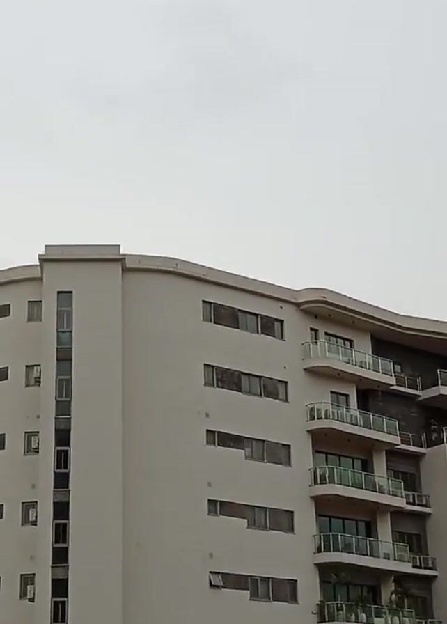 The camera looks up at a tall, white, multi-story building. It has numerous windows arranged in rows. Some windows are open. There are balconies with glass railings on the right side of the building. The sky above is overcast and light grey. A few powerlines are visible in front of the bottom of the building.