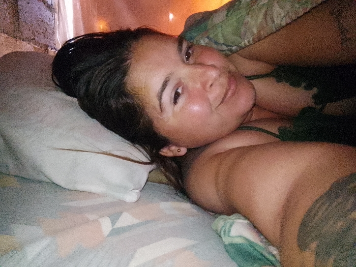 The image displays a single adult female in an indoor setting, likely a bedroom