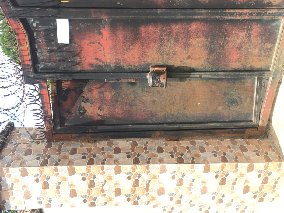 The image displays an exterior view of a weathered metal security gate and an adjacent tiled pillar, located at an unidentified property in Jos, Nigeria