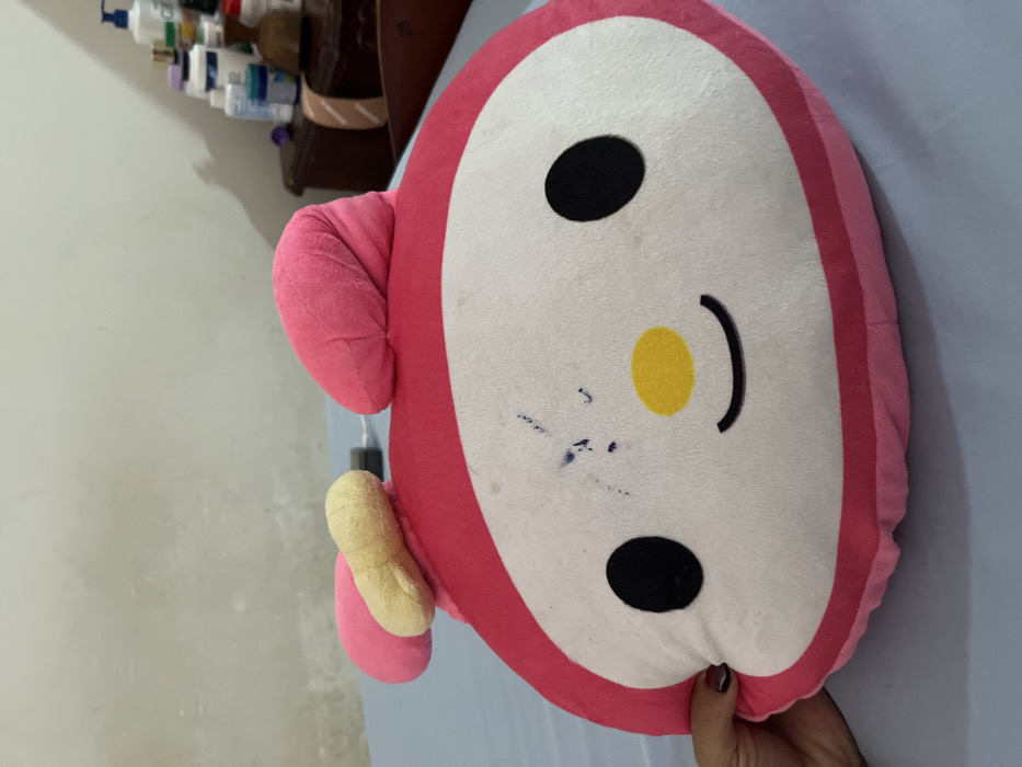 A human left hand, with dark nail polish on the thumb and index finger, grips the lower-left side of a large, round, pink and white plush pillow designed to resemble the My Melody character. The pillow features a white oval face with black oval eyes, a yellow oval nose, and a black curved mouth. Two pink ears are visible at the top, with a yellow bow attached to the left ear. Multiple blue ink-like stains are present on the white face area, primarily above and between the eyes, along with several faint, small light brown spots. The pillow rests on a light blue, textile-covered surface. In the background, a plain, light-colored wall is visible. To the right, a section of a dark brown wooden dresser or chest is present, upon which various plastic and glass bottles, containers, and a white pump dispenser are arranged. A dark-colored electronic device or charger with a white cable is situated on the blue surface behind the pillow's upper left side. The scene depicts an indoor domestic environment, consistent with a room in a residence in Guayaquil, Ecuador, although no specific landmarks or external identifiers are visible to pinpoint a precise location within the city.