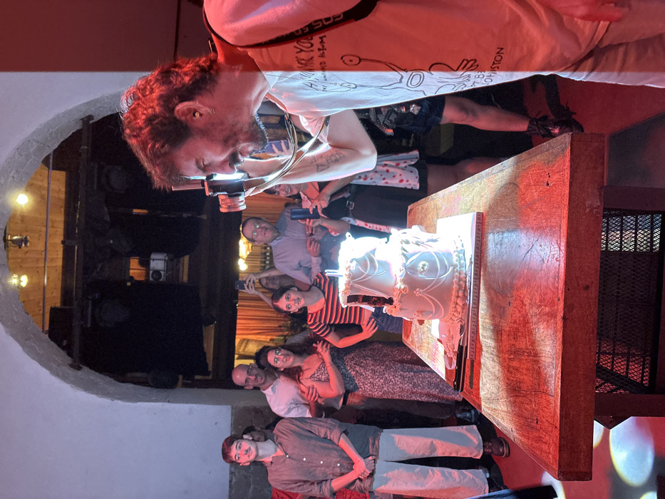 - "A group gathers around a white, two-tiered cake with swirling decorations on a wooden table" by FM-4WJah1, licensed under CC BY 4.0
