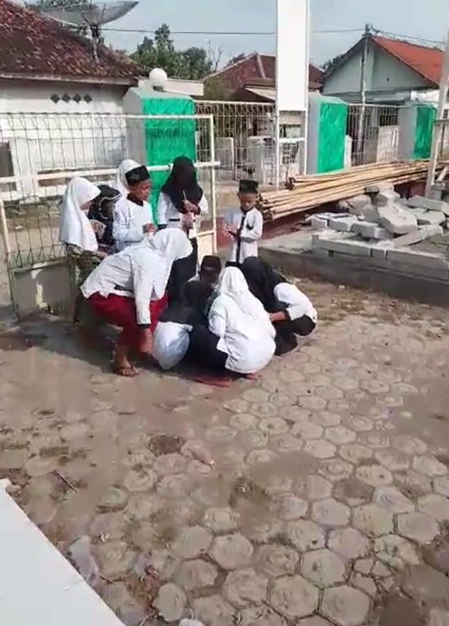 group of about nine children gathered in a small open area outside what appears to be a building, possibly a school or community center, in a residential area. The children are of varying ages, with some appearing to be elementary school age and others a bit older. They are dressed in what seems to be uniforms, with some wearing white tops and dark bottoms and others in white robes with headscarves. The children are crouched in a circle, seemingly focused on something in the center. One child in particular appears to be the focus of the group. The area surrounding the children is paved with hexagonal concrete blocks, and there is a low white wall to the left of the frame. In the background, there is a white metal fence, buildings with red tile roofs, and a pile of construction materials such as lumber and concrete blocks. The weather appears to be sunny and bright.
