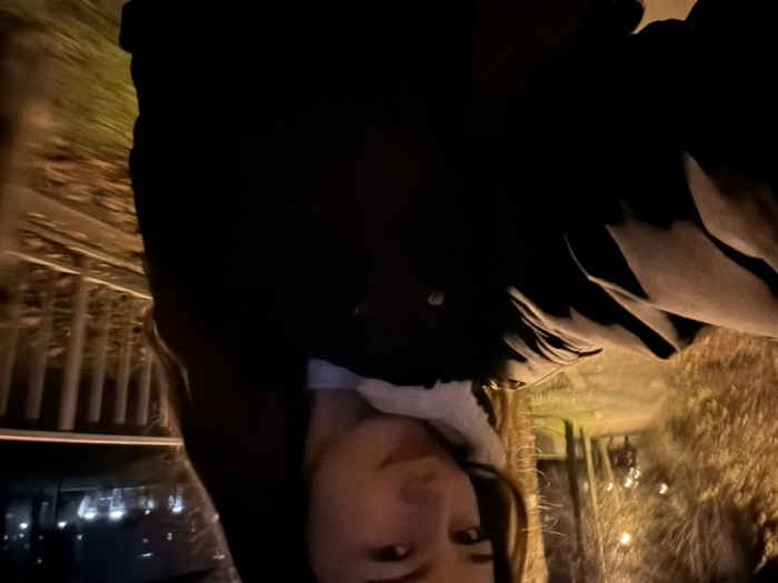 A dark-haired person with fair skin is facing forward, wearing a dark jacket with a light-colored collar. The person is positioned against an outdoor backdrop featuring a fence, foliage, and glimpses of distant lights, possibly from vehicles. The lighting casts a shadow over parts of the face and clothing. The image has an rotated orientation.