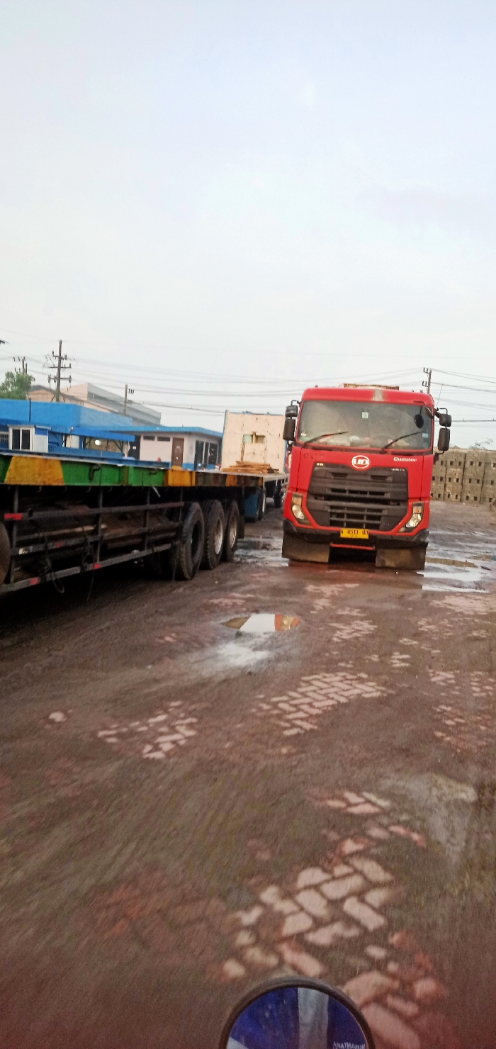 A red UD Quon truck is parked on a brick-paved lot with a puddle reflecting light