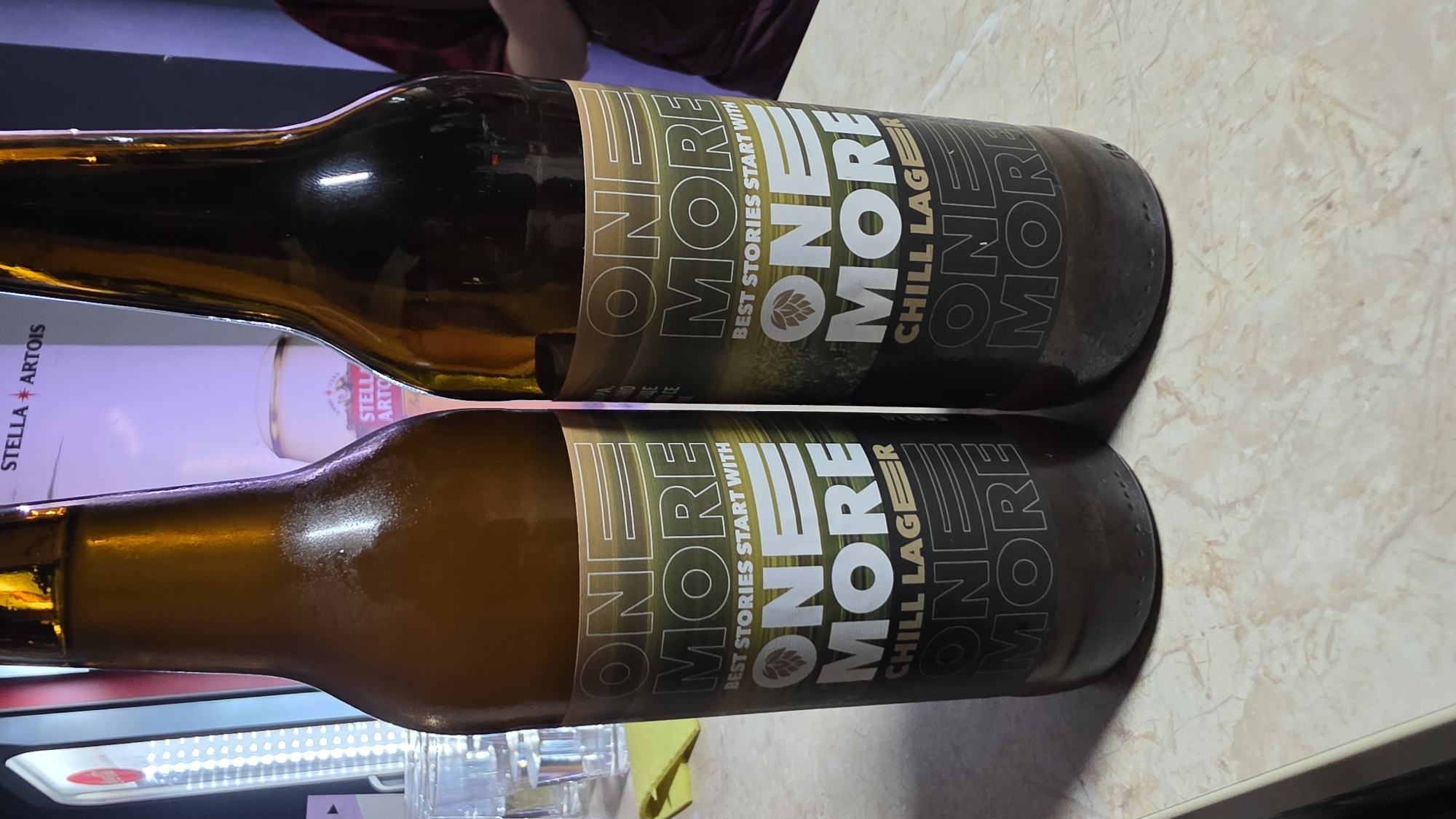 two bottles of "One More Chill Lager" beer lying horizontally on a counter with a marble-like pattern. The top bottle has a darker glass than the bottom one. Parts of a Stella Artois advertisement can be seen in the background near the bottom left, suggesting the location is a place that serves beer. The counter appears to be indoors. The image does not reveal any specifics to pinpoint the location as Dobrich, Bulgaria. There are no people visible interacting with the objects.