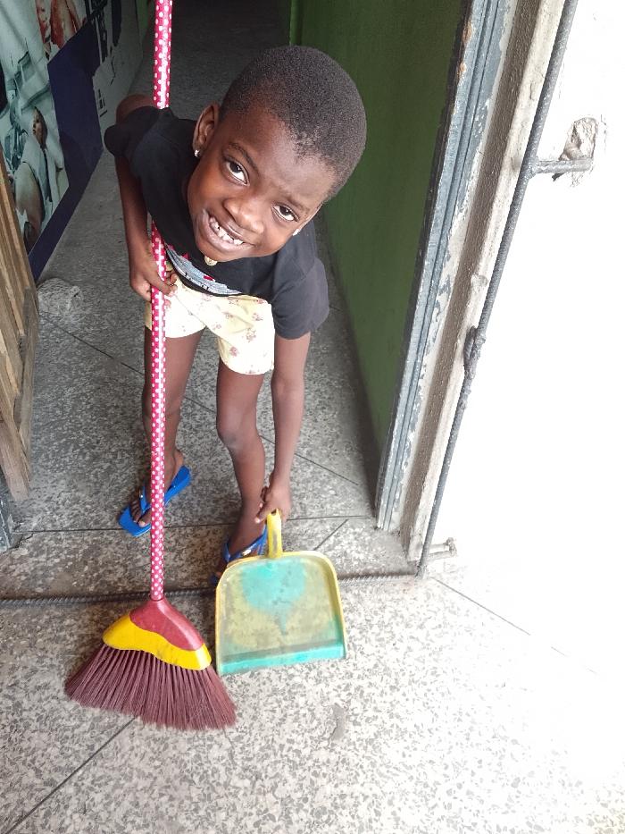 - "A young child with short dark hair and a black t-shirt smiles while holding a broom and dustpan" by FM-giur32, licensed under CC BY 4.0