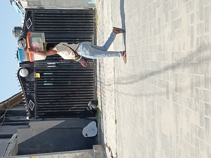 The image depicts a daytime street scene in Ado, Nigeria. A single adult female is observed walking from right to left across a light-colored interlocking paver pathway. She wears a cream-colored short-sleeved top, light blue jeans, and dark flip-flops. A dark shoulder bag is slung across her body. She carries a stack of three plastic containers on her head—a light blue one on top, an orange one in the middle, and a translucent one at the bottom—topped with a black plastic bag. Her right hand is raised, steadying the load. A long shadow from her extends onto the paved ground. In the background, a large, dark-colored metal gate with vertical slats, decorative diamond patterns, and spiked finials secures a property. To the left of the gate, a dark building wall is partially visible, with an irregularly shaped white object and a black plastic bag resting on the ground near its base. To the right of the gate, additional structures, including a blue tarp and an elevated black water tank, are visible. The sky is clear and light blue.