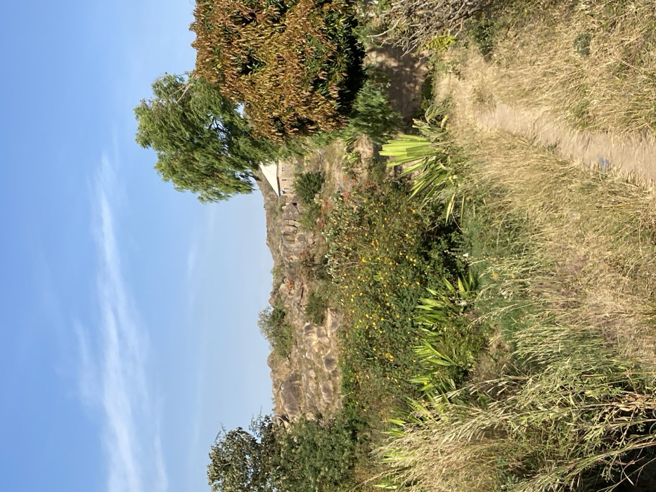 A rocky hillside under a clear blue sky. A small white building sits atop the rocks, partially obscured by a green tree. Dense vegetation covers the slope, featuring yellow flowers and broad green leaves. To the right, a narrow path winds through tall, dry grass. Brown leaves crown another tree, providing a contrast to the vibrant greenery and the pale rocks.