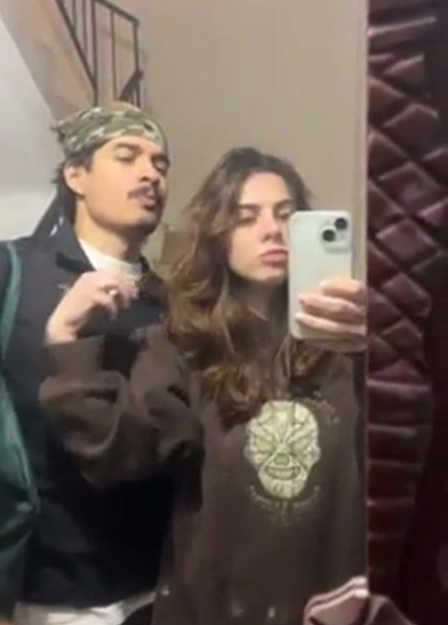 A young woman is taking a selfie video of herself and a young man in a mirror. The woman has long brown hair and wears a brown sweatshirt with a skull graphic on the front. She is holding a white iPhone. The man is standing behind her, wearing a camouflage bandana, a white undershirt, and a black zip-up jacket. He has a green shoulder bag. He is touching the woman's hair and neck. The mirror has a dark brown carved frame. A staircase and a painting are visible in the background.