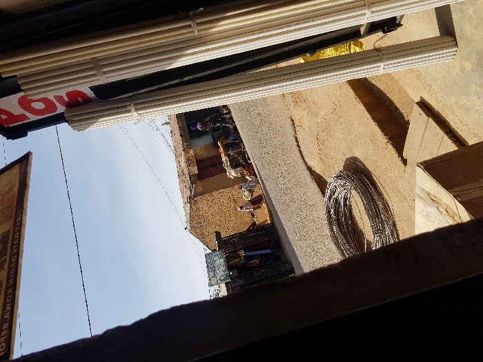 This image depicts a street scene in Jos, Nigeria, viewed from inside an establishment