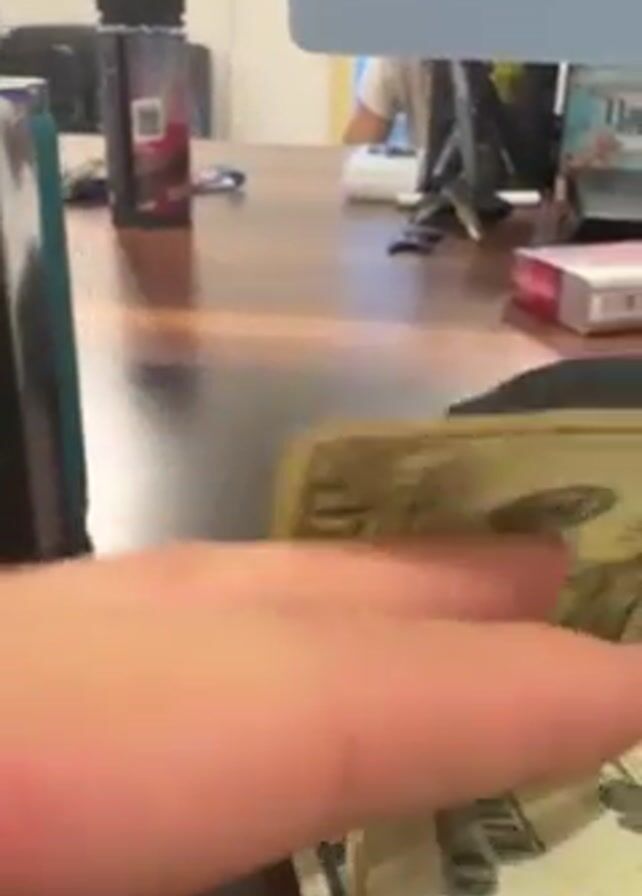 A close-up shot depicts a hand counting US twenty-dollar bills on a wooden desk. The person's fingers are visible as they manipulate the bills. The camera is positioned relatively close to the action, offering a clear view of the bills and the immediate surrounding area. The desk is cluttered with several items, including a bottle of vape liquid, a pack of cigarettes, a mouse, and a computer monitor. The overall lighting of the scene is adequate.