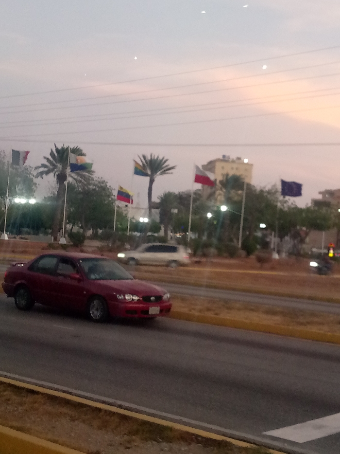 The image depicts an urban street scene in Pampatar, Venezuela, during either dawn or dusk