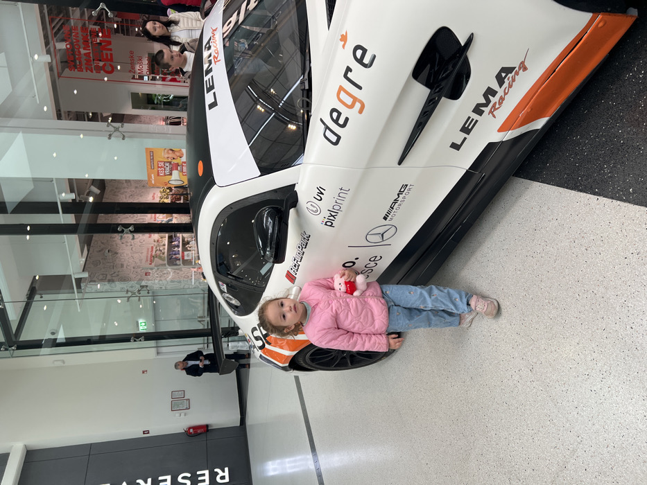 The image depicts an indoor scene within a modern shopping mall in Ljubljana, Slovenia. A young girl, approximately 3-5 years old, with light brown, curly hair, stands in the foreground, slightly left of center. She wears a light pink quilted jacket, light blue jeans with small patterns, and light pink sneakers. In her right hand, she holds a small, pink, plush toy with red markings. Her gaze is directed straight ahead, towards the viewer. To her right, a white Mercedes-Benz AMG GT3 race car is prominently displayed. The car features a black and orange racing livery with various sponsor decals, including "Lema Racing," "RCfunPark," "uvi," "pixlprint," "degre," and "AMG MOTORSPORT." The vehicle has a black roof, a large rear spoiler (partially visible), and black multi-spoke wheels. In the background, on the left, an adult male with graying hair, wearing a dark suit jacket, stands near a dark pillar labeled "RESERVE" in white vertical text. A red fire extinguisher is mounted on this pillar. On the right, beyond the race car and visible through a large glass storefront, an adult female with dark hair and a light-colored jacket stands next to a boy with light brown hair. Both are looking towards the right side of the frame. The glass storefront reveals a brightly lit retail interior with merchandise. Signs with Slovenian text are visible in the background, including "KEŠ SE VRAČA!" (Cash is Back!) on an orange poster and "ŽENSKE BLAGOVNE ZNAMKE PO UGODNIH CENE" (Women's Brand Names at Favorable Prices) on a white sign. The floor is a light gray speckled or terrazzo-style tile, transitioning to a darker gray or black section on the right.