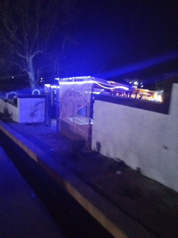 A night view captures a structure adorned with lights, standing next to a white wall. The scene exhibits a dim ambiance, with blue light dominating the color palette. To the left, a bare tree looms beside a wall with tires on top. The image, taken from an elevated position, features a partially visible foreground railing, suggesting a balcony or bridge perspective. Overall, the photograph evokes a sense of stillness and solitude in the dark.