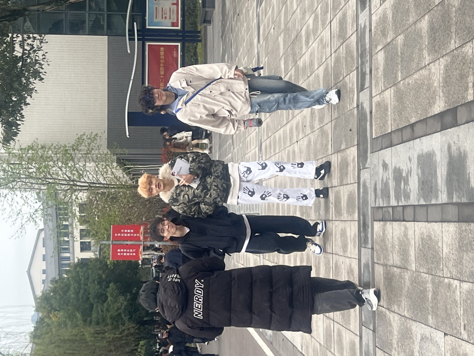 This image depicts a paved pedestrian area, likely within a university campus or public space, in Jiangjin, China. The scene is illuminated by diffuse daylight under an overcast sky. In the foreground, four young males are observed walking from left to right. The leftmost individual, with his back to the camera, wears a long black puffer coat with "NERDY." in white text on the upper back, dark trousers, and light-colored athletic shoes. To his right, a male wearing glasses, a black zip-up hoodie, dark trousers, and white-and-blue athletic shoes walks forward with a slight smile. Adjacent to him, a male with bright orange hair wears a camouflage jacket featuring a fur-lined collar, a white undershirt, white trousers patterned with numerous black handprints, and black athletic shoes. He holds a white notebook or folder in his left hand. The rightmost individual has dark, curly hair and is attired in a light beige or off-white jacket, light blue jeans, and white athletic shoes. A blue strap, likely from a bag, crosses his torso, and he carries a dark water bottle in his right hand. He also appears to be wearing over-ear headphones. These four individuals are moving in the same general direction, with the three middle-to-right individuals appearing to walk together. The ground is a tiled pedestrian path composed of light grey rectangular pavers, some showing signs of dampness. In the middle ground, several deciduous trees with light green foliage are visible. Between the trees, red vertical banners with Chinese characters are affixed to poles. In the background, multiple modern multi-story buildings are present, including a prominent light-colored building with a dark roof and numerous windows, and another structure with dark window panes and light grey paneling. Several other indistinct individuals are visible in the background, sparsely populating the area.