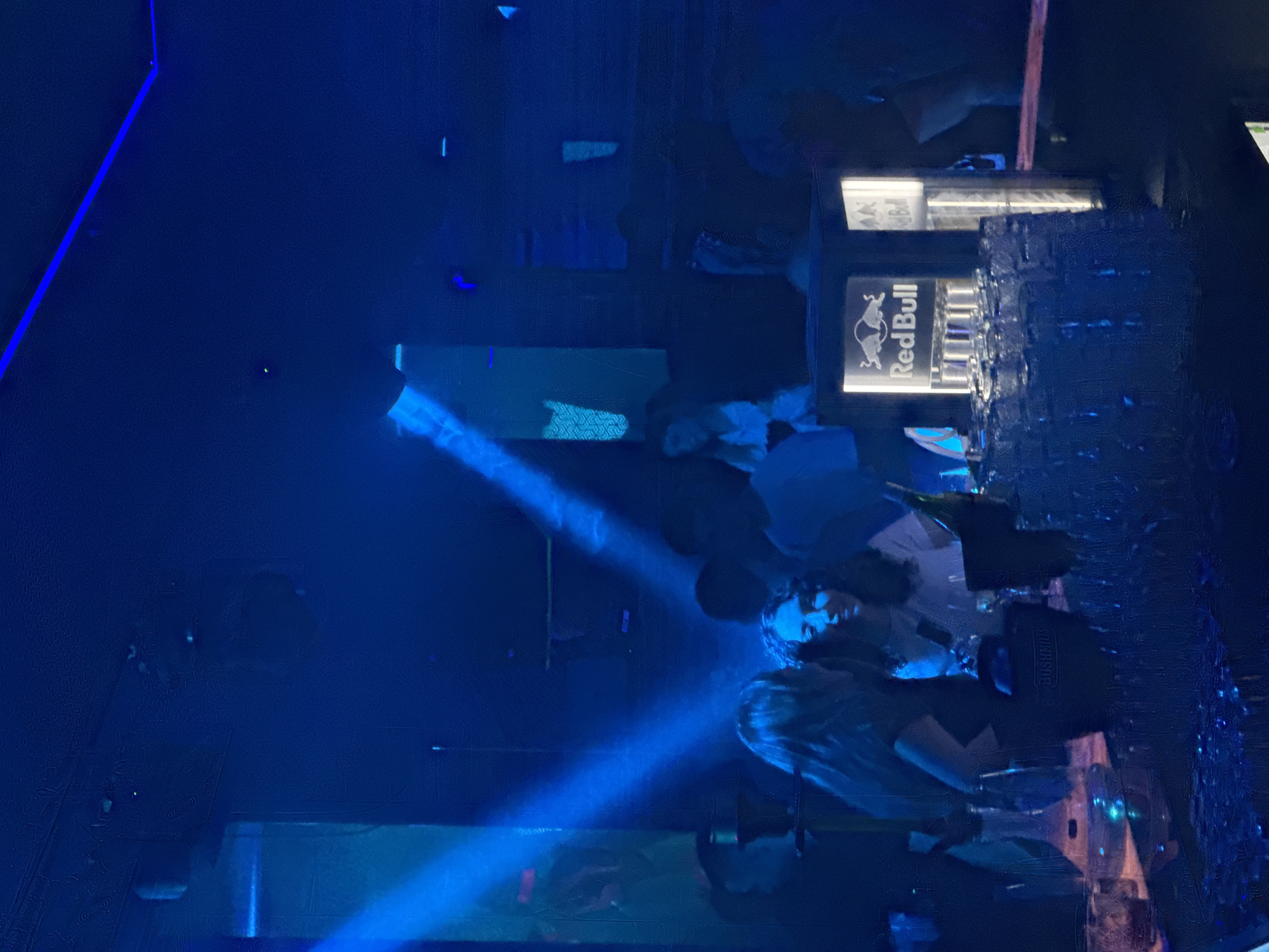 A nightclub in Sofia, Bulgaria. The scene is illuminated by blue lighting, creating a vibrant atmosphere. Bartenders are serving drinks at the bar, which features a Red Bull advertising display. Several people are present, some sitting and some standing, interacting with each other. There are also a large amount of glasses at the counter.