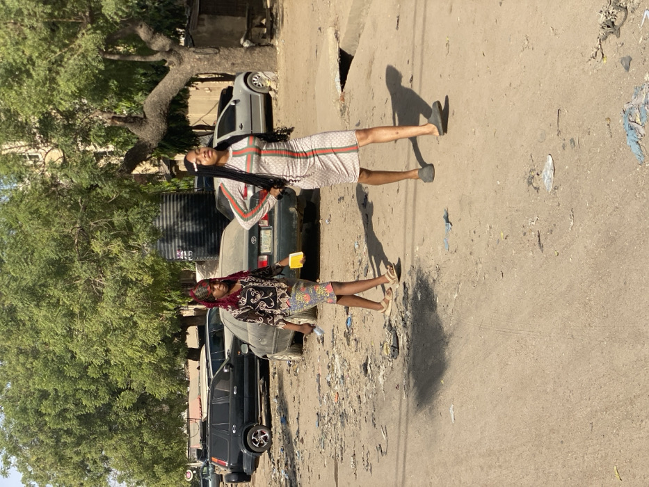 The scene depicts an outdoor urban environment, identified as Sabon Gari East, Nigeria, under bright daylight conditions. Two adult females are observed walking from left to right across an unpaved, uneven dirt street heavily littered with refuse, including plastic bags and other debris. A dark, possibly wet or oily patch is visible on the ground in the foreground. The first female, positioned on the left, has dark red braided hair, possibly covered by a patterned scarf. She wears a black long-sleeved blouse with white patterns, a knee-length patterned skirt in multiple colors (green, blue, pink), and light-colored flat sandals. She holds a small, light-colored object in her left hand and a yellow rectangular item in her right hand. The second female, positioned to the right of the first, has long, dark braided hair styled with a light-colored clip near her forehead. She wears a form-fitting, long-sleeved, knee-length dress with a light beige base, a repeating logo pattern, and distinct red and green vertical stripes. She wears dark grey slip-on shoes. Her right hand is placed on her hip. In the background, multiple parked vehicles are visible, including a dark-colored SUV (possibly a Honda CR-V) on the far left, a dusty dark sedan (possibly green or black) directly behind the first female, and a light-colored sedan (silver/grey) further back on the right. A large black cylindrical water tank is situated between the dark sedan and the light-colored sedan. Lush green trees are prominent in the background, with one large, gnarled tree trunk visible on the far right. Faint building structures are discernible behind the trees and vehicles. A concrete-lined ditch or gutter runs along the far right edge of the frame. Shadows on the ground indicate a high sun angle.