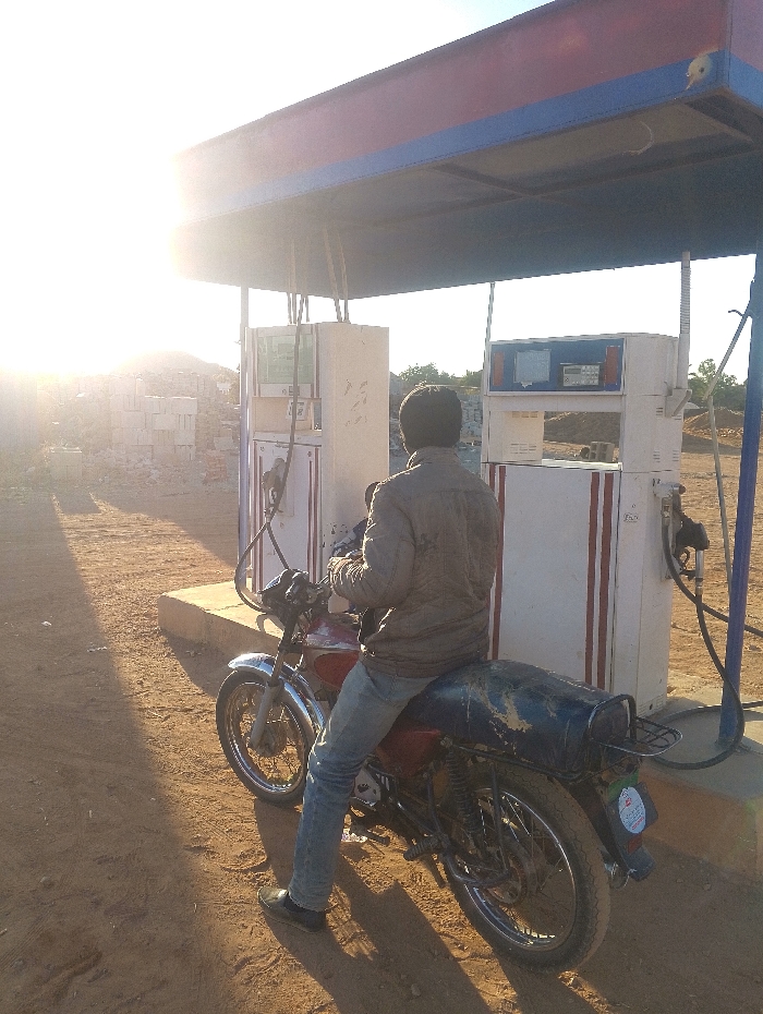 - "A person sits on a red motorbike at an old-fashioned gas station with two outdated pumps under a blue and red canopy" by FM-p2M1d2, licensed under CC BY 4.0