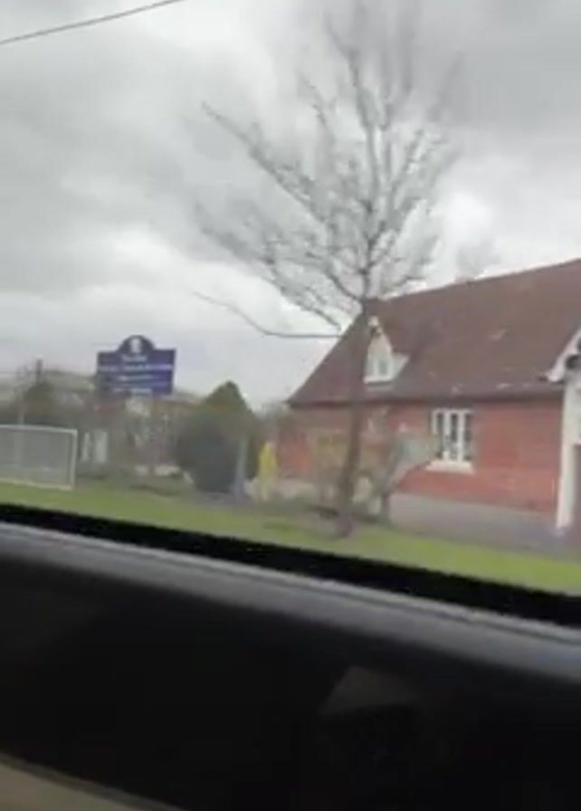 view from the inside of a moving vehicle. The car passes by a brick building with a dark-colored roof, then a blue sign with text that is somewhat obscured. The camera then focuses on the window of the car, which has a mesh sunshade partially drawn. The view through the sunshade reveals a grey sky, power lines, a tree, and a field. The vehicle continues to move, and the scenery passes by.