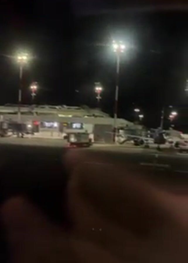 n airport scene at night, viewed from inside an airplane