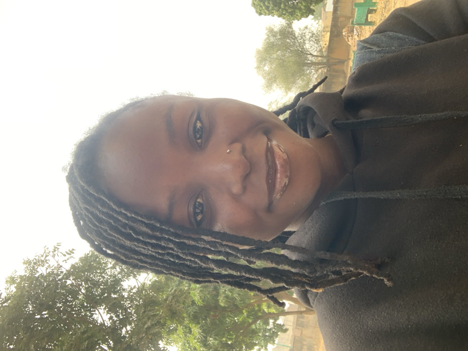 A frontal portrait depicts an adult female with dark skin and dreadlocked hair, primarily swept to her left side