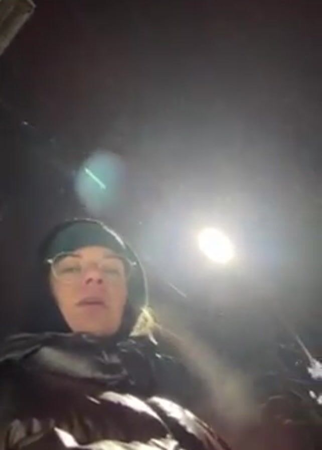 A woman in a black puffer jacket, glasses, and a teal knit hat stands outside in a snowy, dark environment. Snow falls heavily. Behind her, trees covered in snow are visible, along with a white car parked in a driveway. The scene is lit by an overhead light, which creates a bright glare. The woman looks directly at the camera.