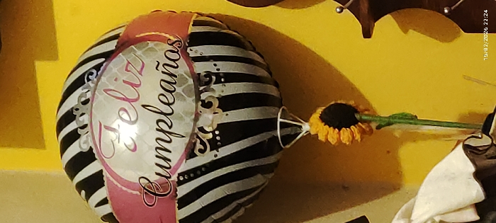 A celebratory birthday balloon with black and white stripes is the focal point. "Feliz Cumpleaños" is printed on its front in a swirling silver script, framed by a pink ribbon. The balloon is tied with string, which is obscured by a small sunflower. The background is a bright, solid yellow wall. A partial view of an ornate wooden decoration hangs on the wall. A timestamp is faintly visible in the top right corner.