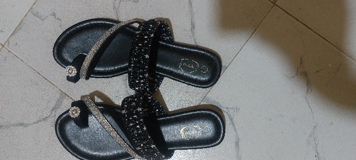 - "Two black sandals with embellishments rest on a tiled surface" by FM-IAH0Z2, licensed under CC BY 4.0