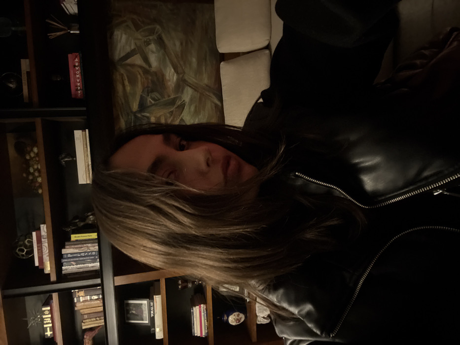 The image captures a dimly lit indoor scene featuring a single female subject positioned centrally. The individual possesses long, dark brown hair, parted near the middle, and is dressed in a black, zippered leather-like jacket over a dark, high-collared garment. Her gaze is directed towards the viewer, and her right eye shows a subtle redness or irritation. The background on the left consists of a dark-toned wooden bookshelf unit populated with numerous books, some arranged horizontally, and various decorative objects, including a metallic spherical sculpture, a silver starburst ornament, a framed picture, and a blue and white ceramic vase. Visible book spines include "DALI" and "TORAL." To the right, an abstract painting with muted tones of brown and green is mounted on the wall, partially obscured by the subject. Below the artwork, a portion of a light-colored sofa with two cushions is visible. The lighting is low and warm, creating distinct shadows and an intimate atmosphere within this indoor residential or study setting, located in Mexico City, Mexico.