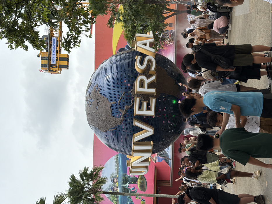The iconic Universal globe stands amidst a crowd of tourists, dwarfing them in size. The scene is captured during the day, with the globe's detailed continents clearly visible. A construction crane with "MCF SINGAPORE" inscribed on its side rises in the background, adding a touch of industrial contrast to the theme park atmosphere. The colorful Universal Studios facade serves as a backdrop, enhancing the vibrancy of the scene. Palm trees add a tropical feel.