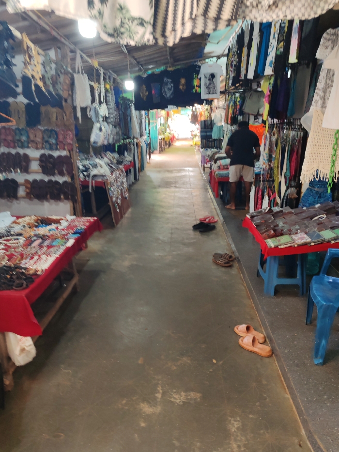 The image displays an indoor market aisle located in Querim, India, viewed from the foreground looking towards an illuminated distant exit