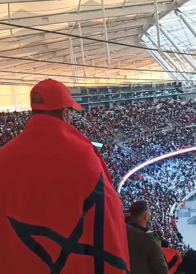 crowded stadium, likely for a soccer game. The camera pans from a person wearing a red hat and a Moroccan flag as a cape, to the field below. The stadium is packed with people, and a large flag with red, black, and white sections is being displayed on the field. The ceiling of the stadium is visible, with white beams and supports. People in the stands are taking pictures and watching the pre-game activities on the field.