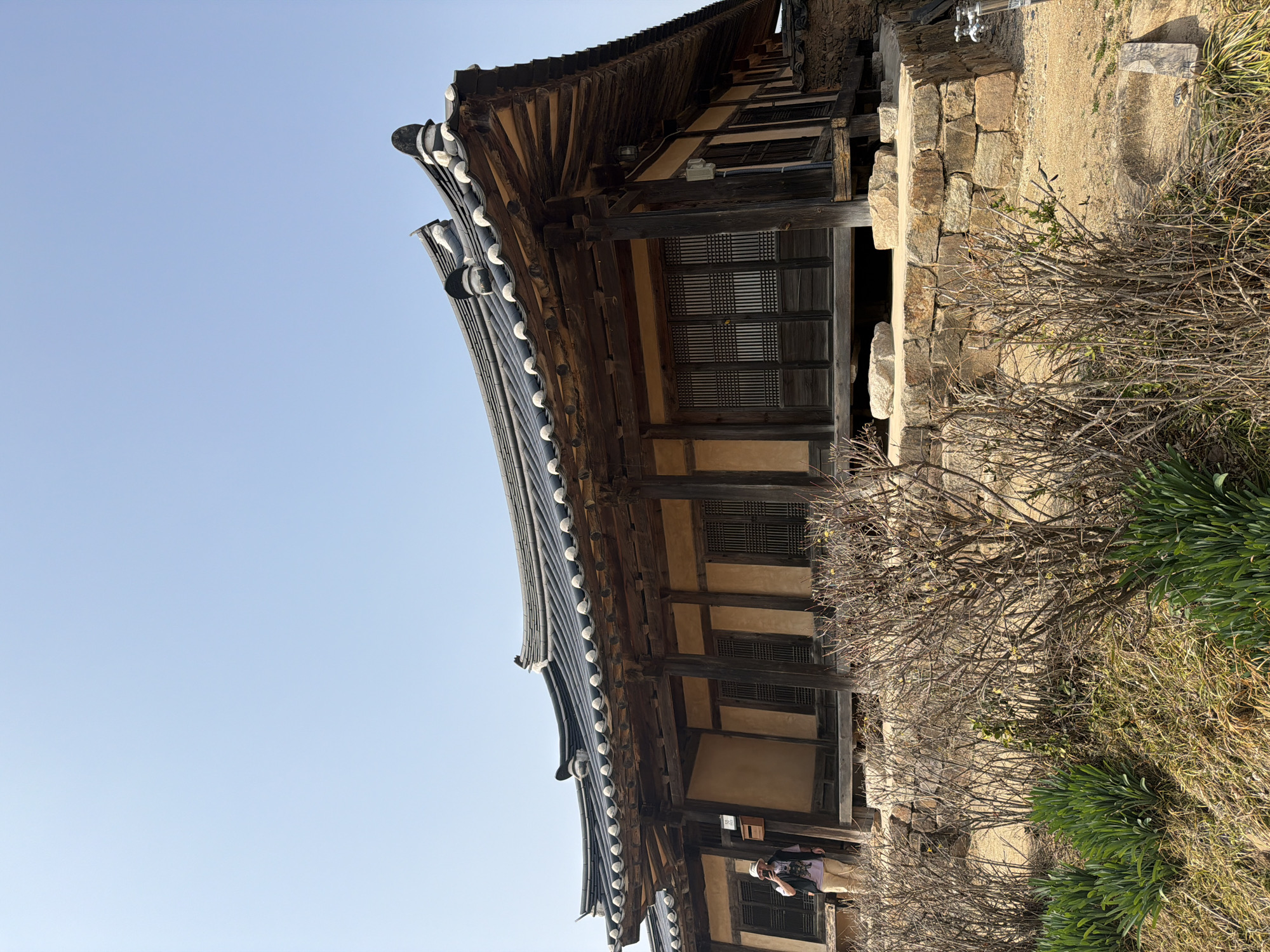 The image displays a traditional Korean Hanok building under a clear, light blue sky in Andong-si, South Korea. The building is constructed with dark wooden pillars and beams supporting a distinctive dark tiled, curved roof featuring white decorative end tiles and exposed rafters. The walls between the wooden framework are a light, earthy color, and the windows/doors are composed of dark wooden lattice panels. The structure is elevated on a stone block foundation. To the left, a single male individual is observed, partially obscured by a building column. He wears a light-colored hat, a dark vest over a lighter shirt, and light trousers. He holds a white smartphone or small camera up to his face, appearing to photograph the scene. The foreground consists of dry, light-brown soil with patches of green, grass-like plants and numerous dormant bushes with thin, bare branches. Some of these bushes display small clusters of yellow blossoms. On the far right, near the ground level, a silver-colored metal spigot or faucet structure is visible, adjacent to a small wooden plank and a circular indentation in the dirt.