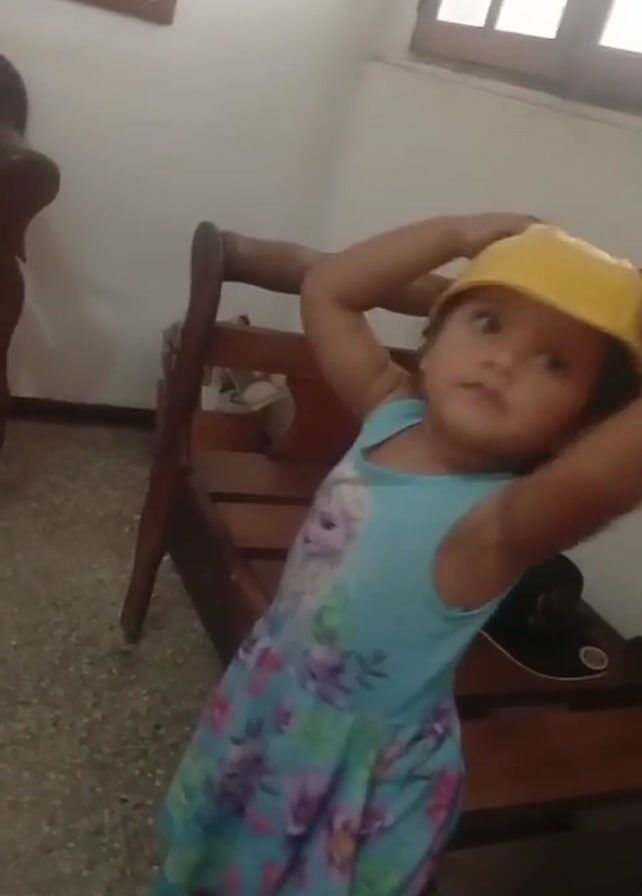 A young girl is standing in front of a wooden chair or bench, wearing a blue dress with a floral pattern and an image of Elsa from the movie Frozen on the front. She's also wearing a yellow plastic construction helmet. She puts her hands on the helmet, adjusting it on her head, and looks to her left, then toward the camera. A framed painting hangs on the wall in the background, along with a window. The floor appears to be tiled or made of stone.