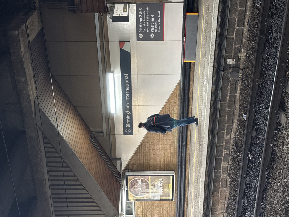 The image captures a scene at Birmingham International railway station, located within the Metropolitan Borough of Solihull, United Kingdom