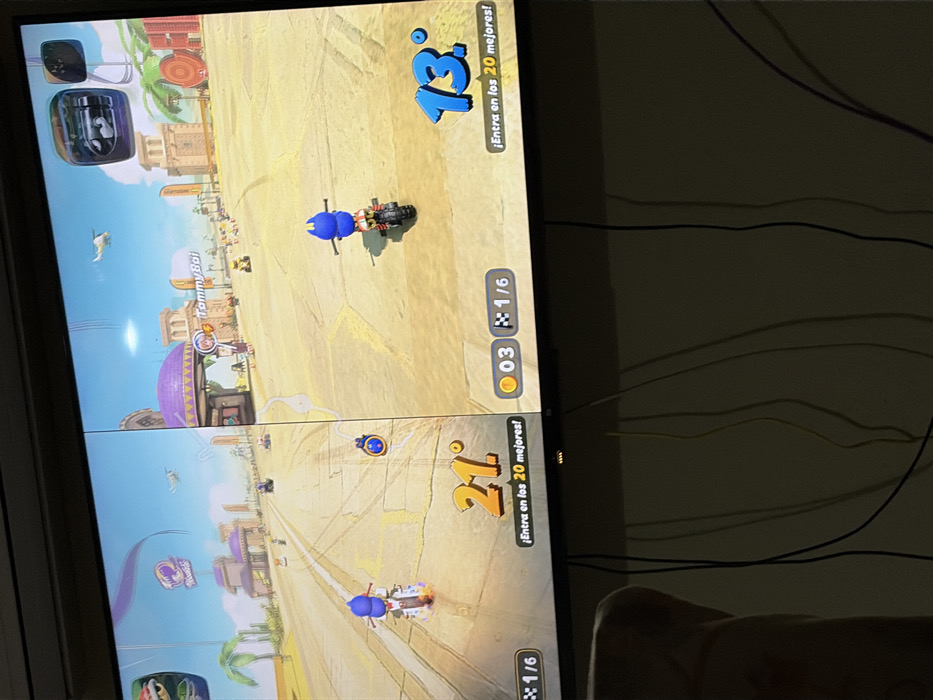 The image displays a digital screen showing a split-screen view of a racing video game. The game environment is a desert-themed track featuring sand-colored structures, some with domed roofs, palm trees, and a bright blue sky with a helicopter visible. Two blue, Sonic-like characters are depicted riding motorcycles. The left side of the screen shows one player character in 21st position ("21°"), currently on lap 1 of 6 ("1/6"). Text in Spanish, "¡Entra en los 20 mejores!" (Enter the top 20!), is visible below the position indicator. The right side of the screen shows another player character, labeled "Tommy Boi," in 13th position ("13°"), also on lap 1 of 6 ("1/6"). This player has collected 3 coins ("03"), and the same Spanish text, "¡Entra en los 20 mejores!", is present. The screen is set against a plain, light-colored wall. Below the screen, several black and yellow electrical cables are visible hanging against the wall. A partial view of a human limb, consistent with an arm or shoulder, is visible in the lower-left foreground. The image does not contain any visual information to verify its location in Dos Hermanas, Spain.